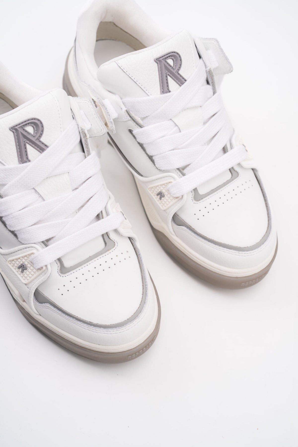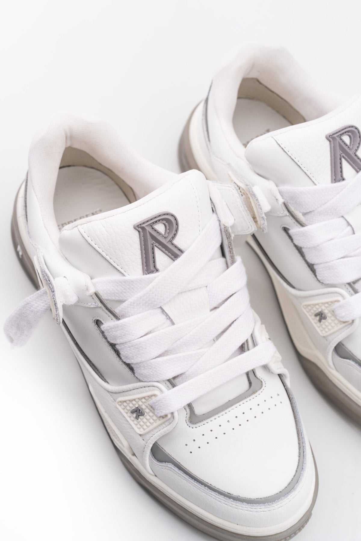 Introducing the Studio Sneaker in White/Grey. Crafted with a fastidious attention to detail, the Studio Sneaker boasts a full leather upper, combining flat and tumbled leather for a luxury textural experience. The mesh lining and leather footbed afford ultimate comfort with every step, while the branded TPU trims on the eyestay and quarter add a minimalist touch of Represent synchronicity.