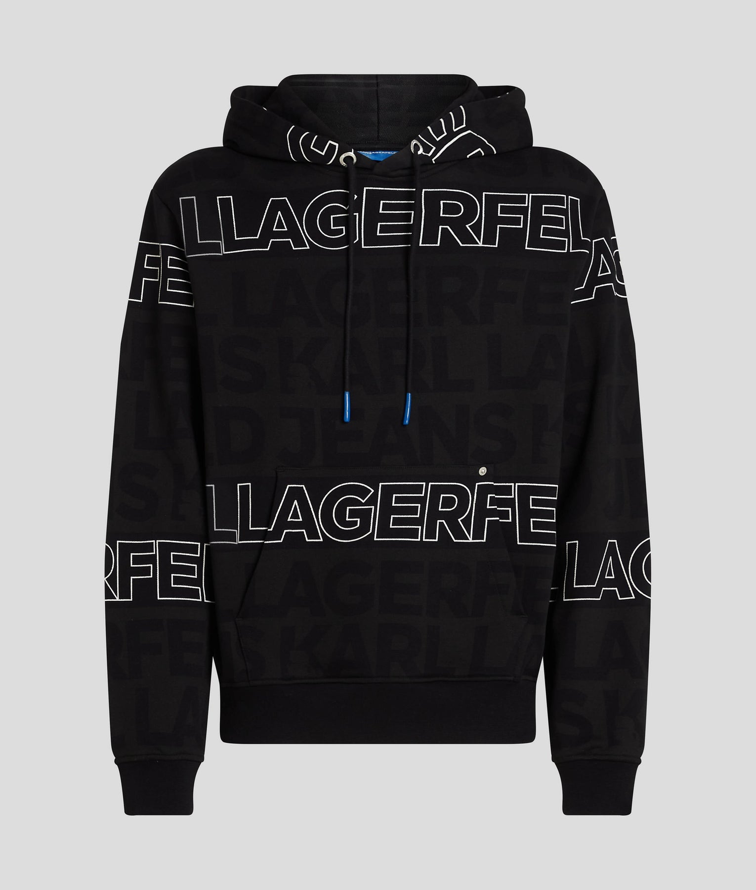 This statement hoodie showcases a bold street style with an all-over KARL LAGERFELD JEANS logo design. The drawcord hood embellished with vibrant ends and light ribbing details add refined touches to this athleisure favorite.
