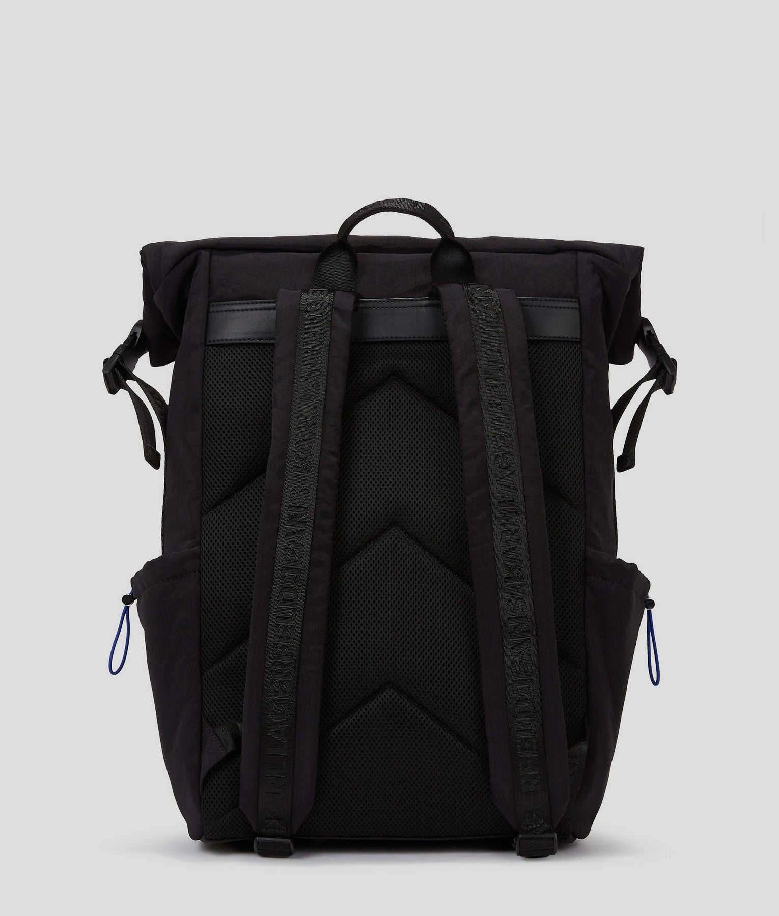 Combining urban flair and functionality, this utility-inspired backpack features a roll-top silhouette with a secure zip closure and contemporary buckle accents. A top grab handle, adjustable shoulder straps and practical side pockets complete the piece, complemented by statement drawstring cord detailing and a bold KARL LAGERFELD JEANS logo.